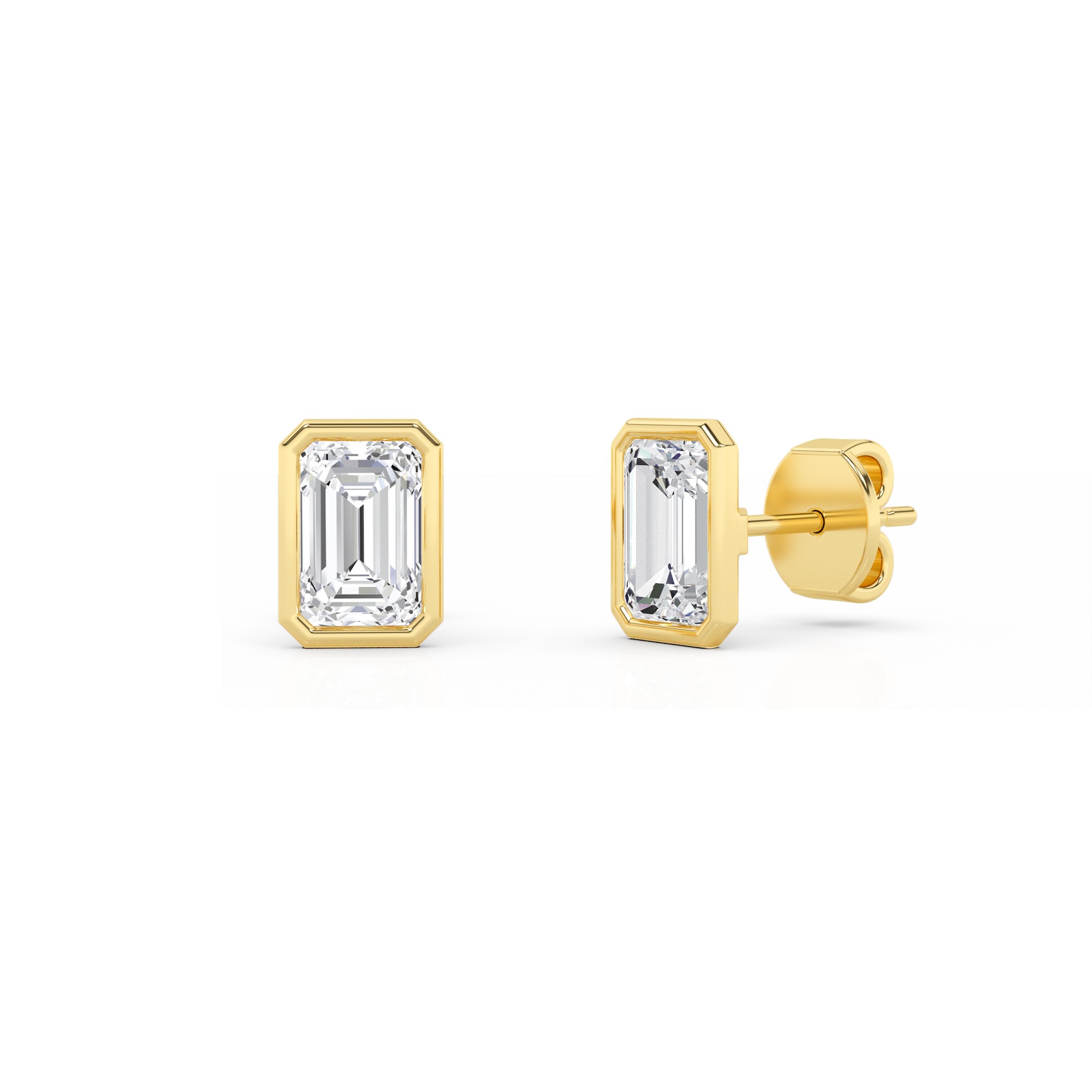 Classic Bezel Set Emerald Diamond Stud Earring in 9K Yellow Gold Push Back